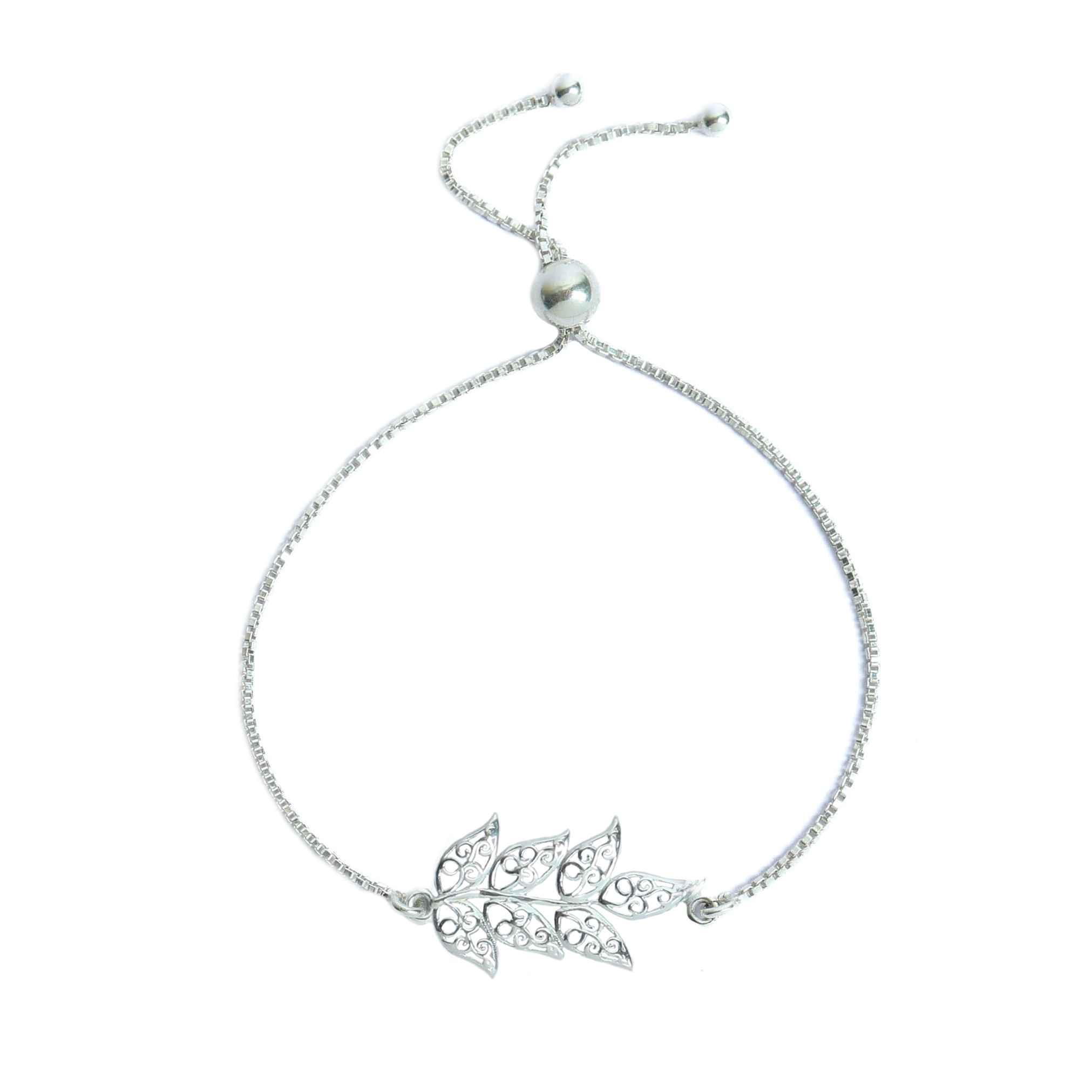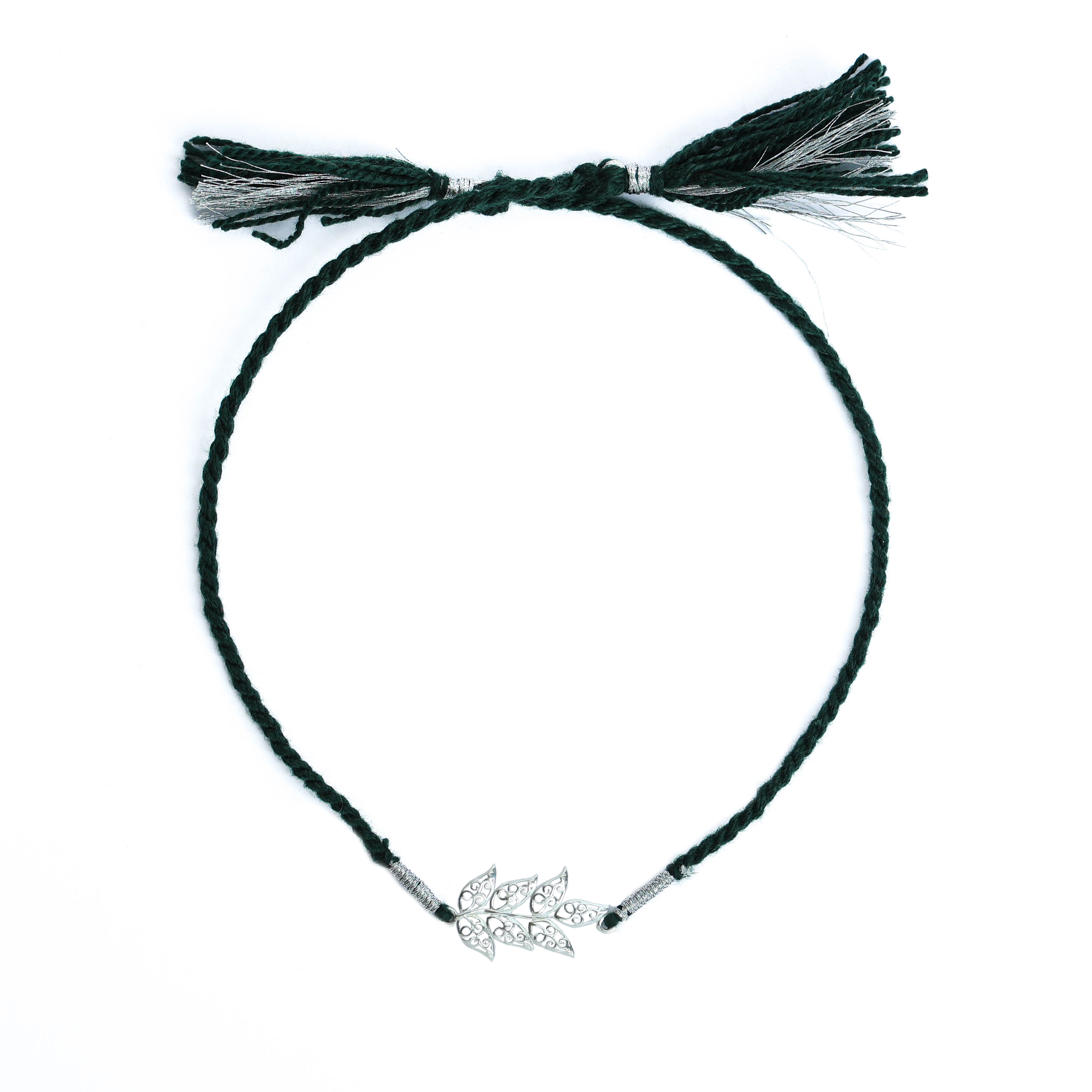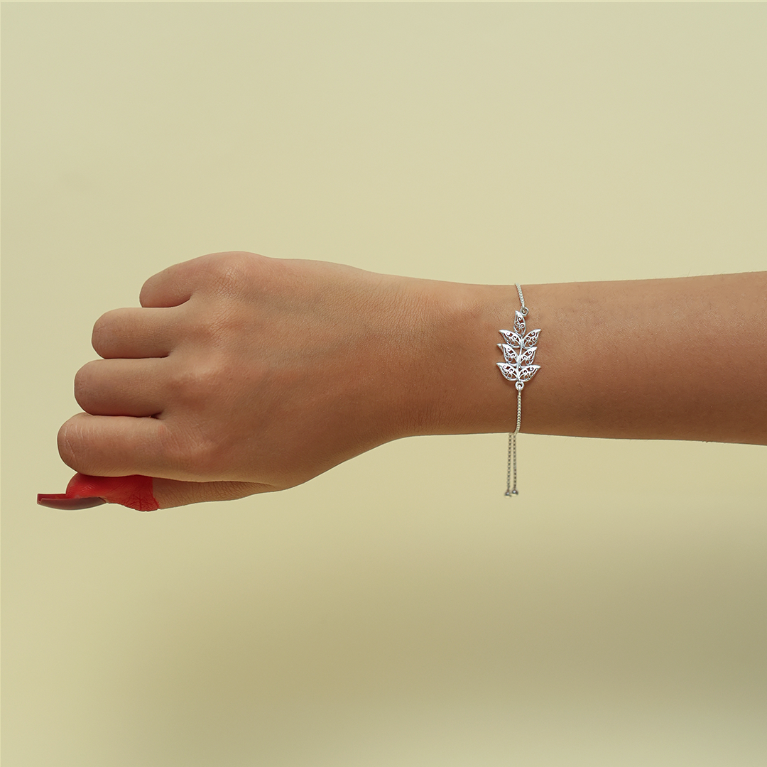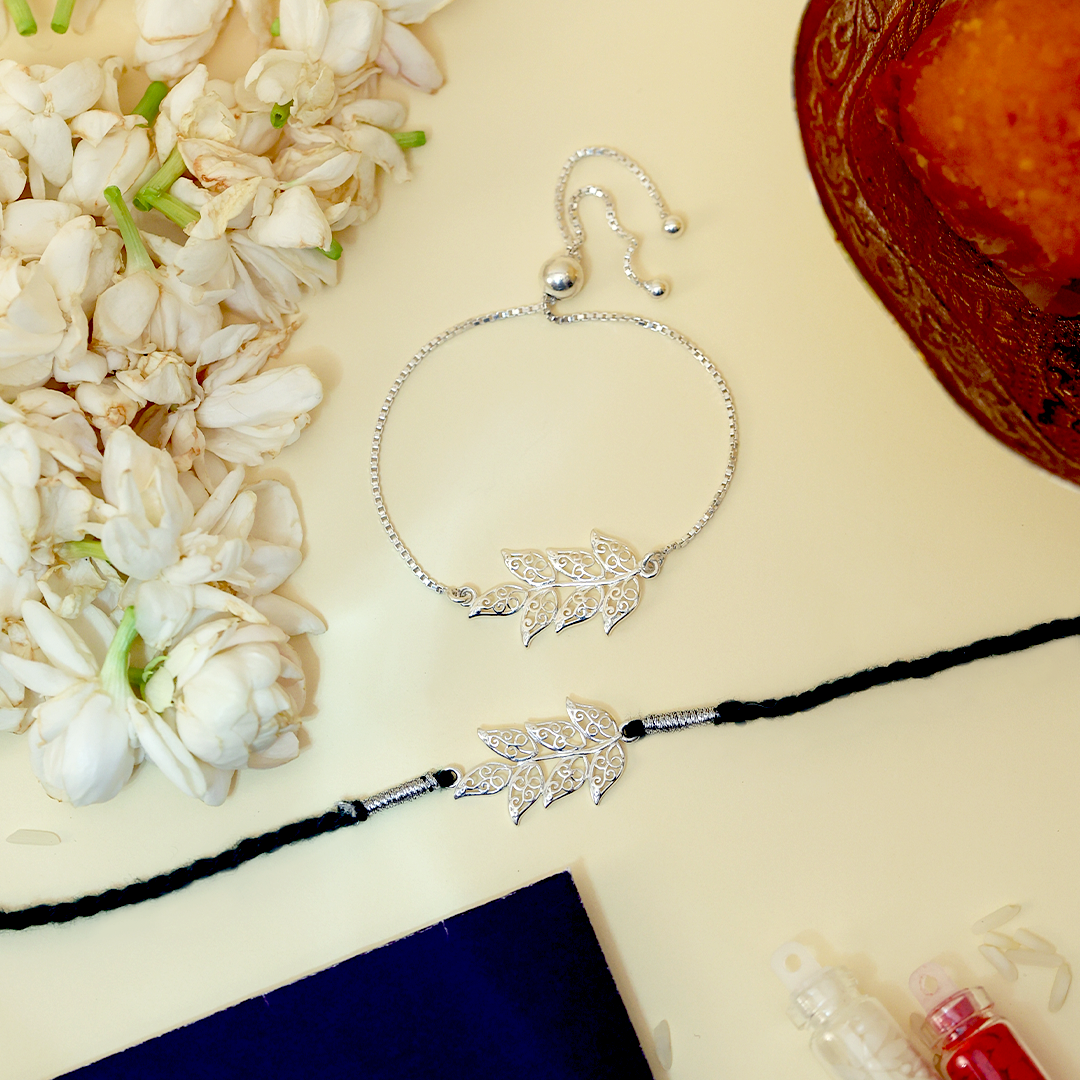 The Silver Bhai Bhabhi Leaf Charm Rakhi with the silver bracelet, set against a green thread, symbolizing the sacred bond and divine love between brother & sister.