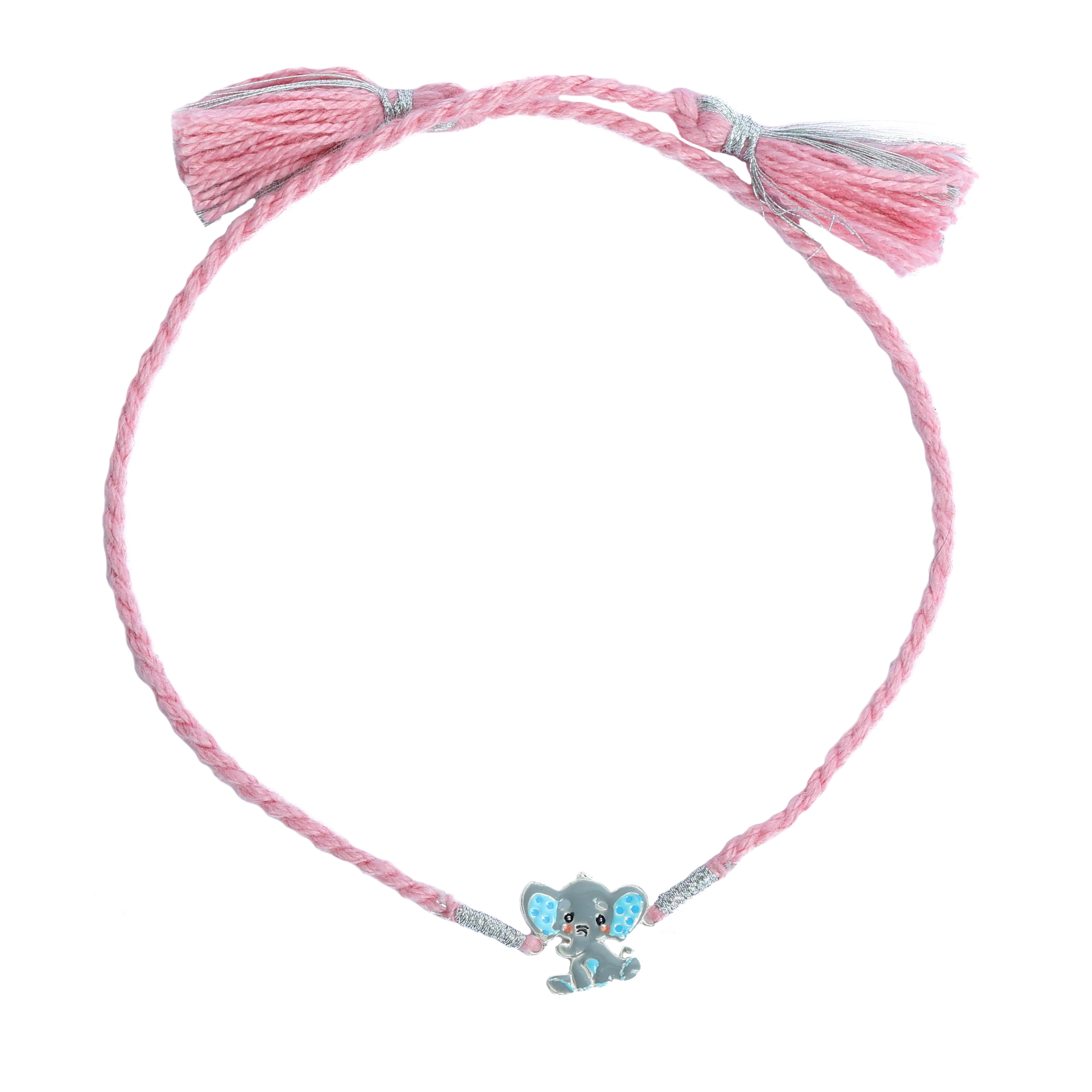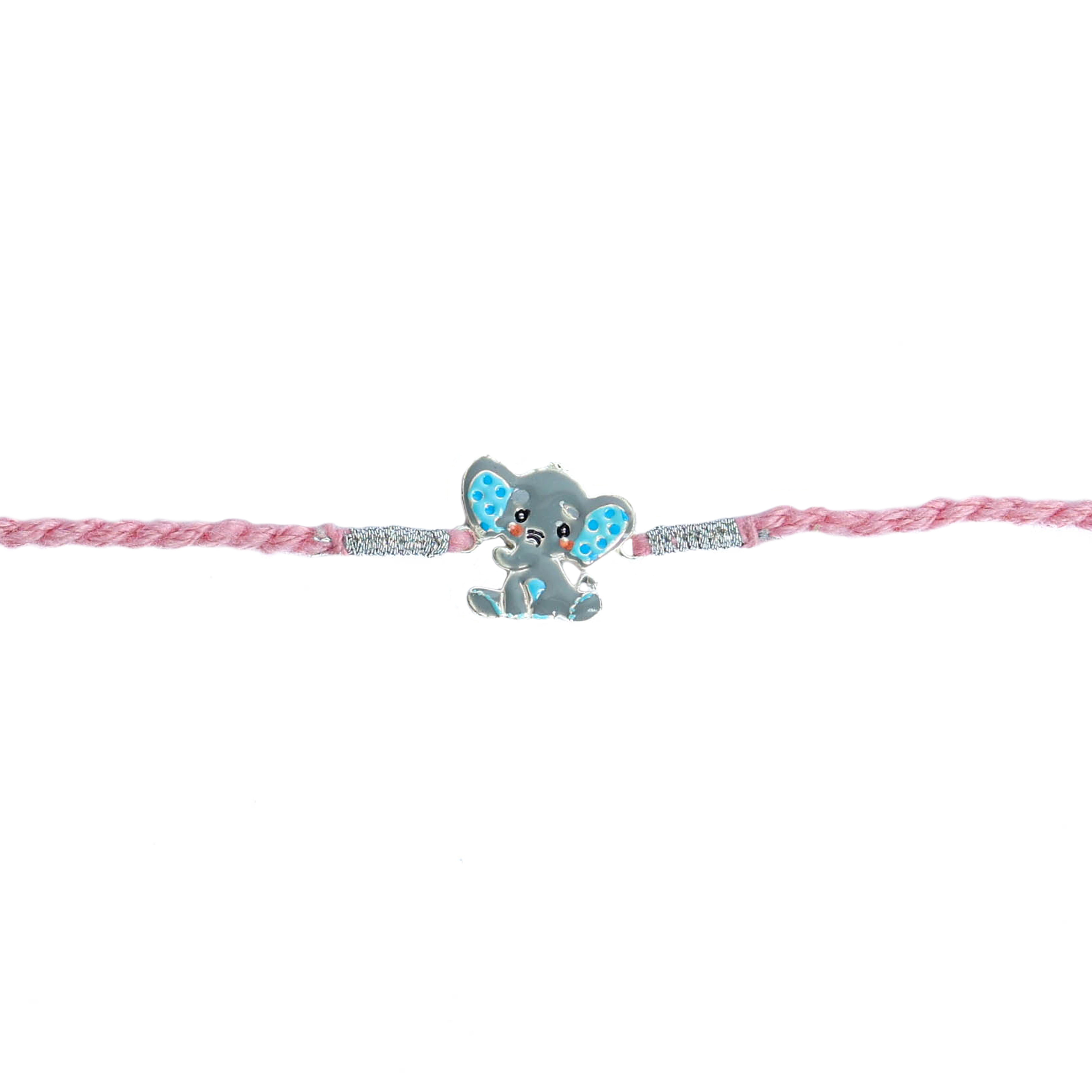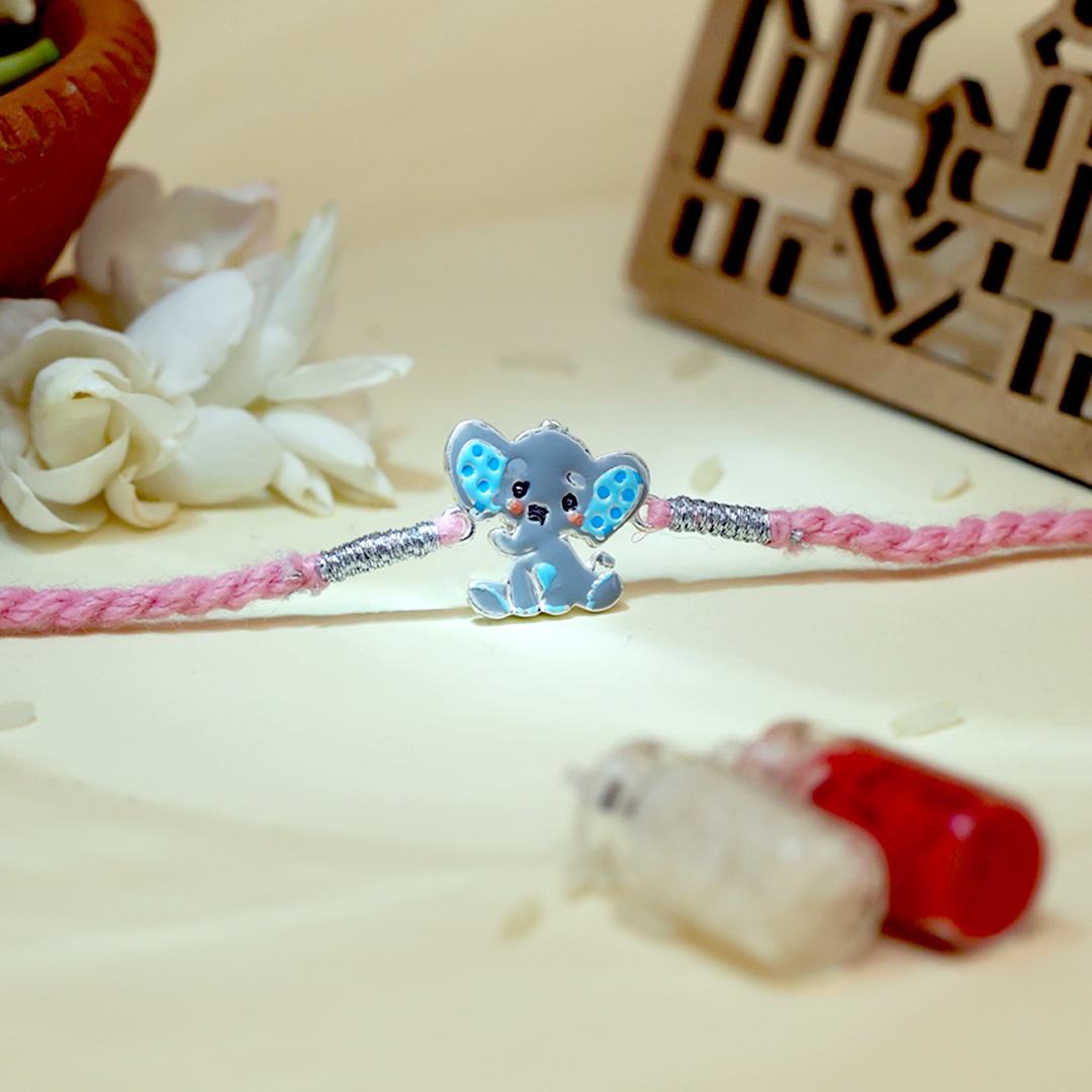 The silver kids rakhi features a Cute Ganesha motif, set against a vibrant red thread, symbolizing the sacred bond and divine love between brother & sister.